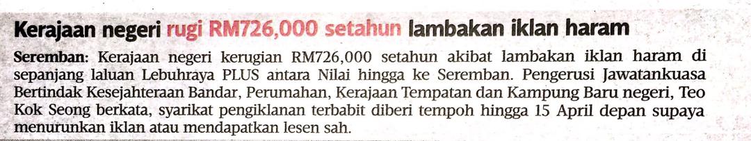Tajuk :Kerajaan negeri rugi RM726,000 setahun lambakan iklan haram