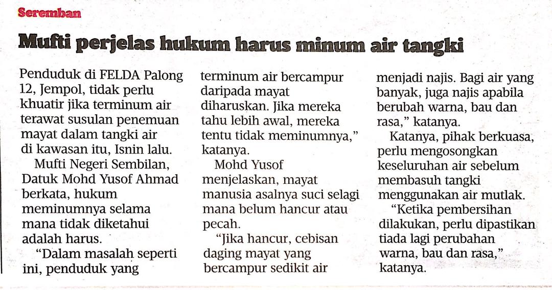 Tajuk :Mufti perjelas hukum harus minum air tangki