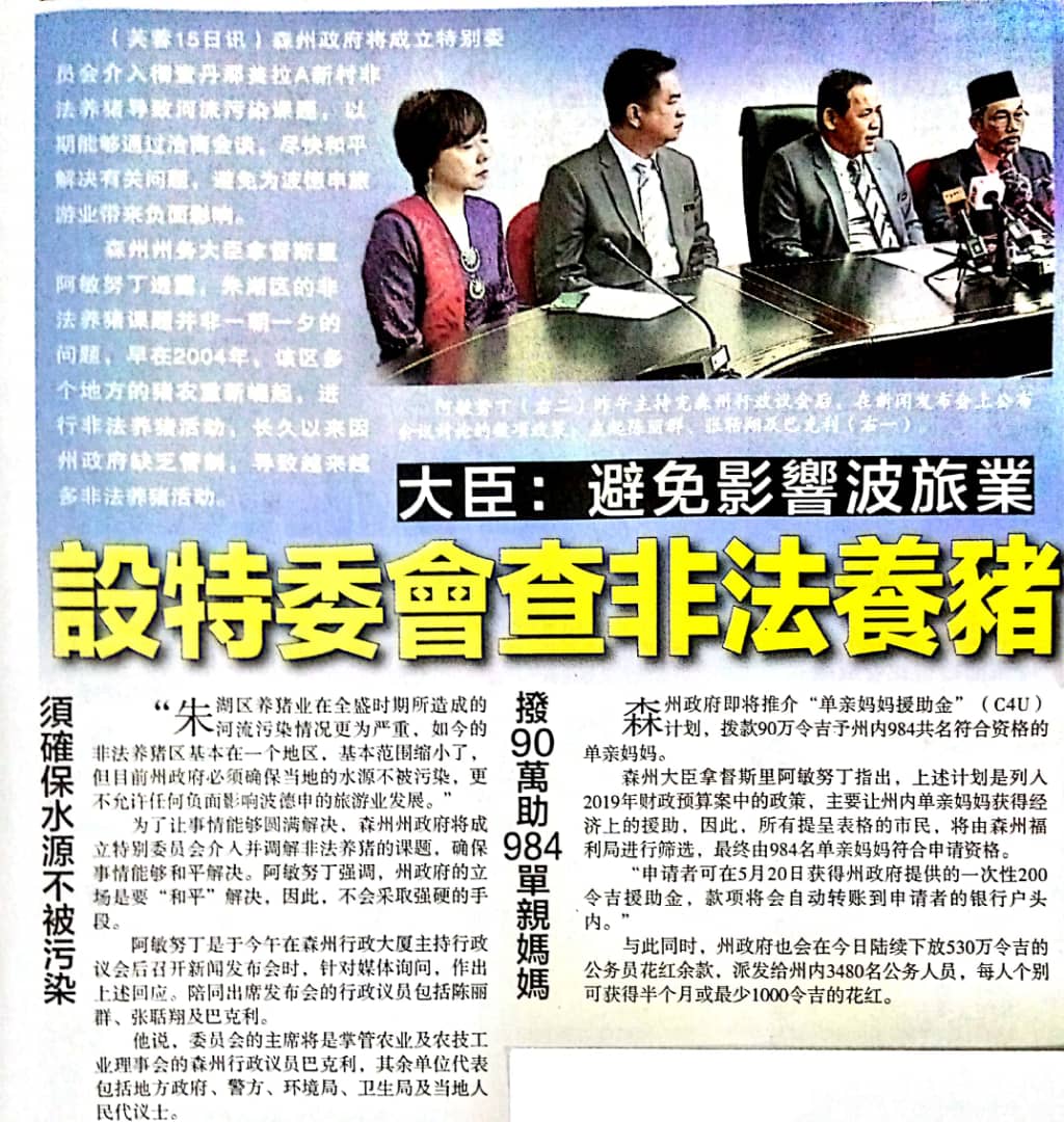 Tajuk :MBNS menyerahkan siasatan sepenuhnya kepada jawatankuasa khas yang diketuai Exco Perindustrian dan Asas Tani berhubung isu kegiatan kawasan ternakan babi yang beroperasi secara haram sejak 2004. Beliau turut mengumumkan pemberian bonus sempena hari raya sebanyak RM1000 kepada penjawat awam negeri juga pelancaran program Care 4 You (C4U) khas untuk ibu tunggal yang berdaftar dengan e-kasih.