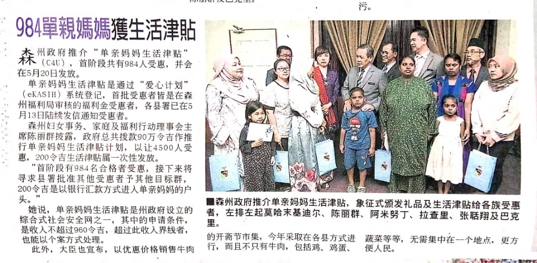 Tajuk :Kerajaan negeri memperuntukkan sejumlah RM900.000 bagi menjayakan program Care 4 You (C4U) untuk membantu ibu tunggal sekitar Negeri Sembilan. Bantuan sebanyak RM200 akan diagihkan kepada ibu tunggal terpilih yang berdaftar dengan E-Kasih. MBNS turut mengumumkan agihan bonus sempena hari raya yang bakal tiba kepada penjawat awam negeri sebanyak RM1000 dan dibayar pada 15 Mei 2019.