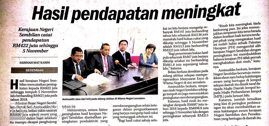 Tajuk :Seremban: MBNS berkata hasil kerajaan Negeri Sembilan telah mencatatkan peningkatan kepada RM422 juta sehingga tempoh 5 November lalu berbanding RM421 juta pada tahun 2018. Beliau juga berkata antara faktor peningkatan hasil kerajaan Negeri Sembilan adalah kerana peningkatan produktiviti yang memberangsangkan selain ketegasan dalam penguatkuasaan yang berjaya mengutip hasil cukai yang tertunggak sebelum ini.