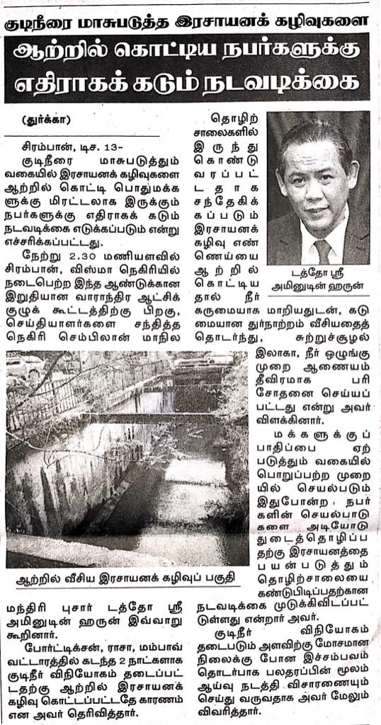 Tajuk :Seremban:MBNS berkata mengenai pencemaran Sungai Anak Air Garam yang berlaku sejak akhir ini pihak Jabatan Alam Sekitar dan juga YB Tuan Veerapan telah memantau dan melakukan siasatan.