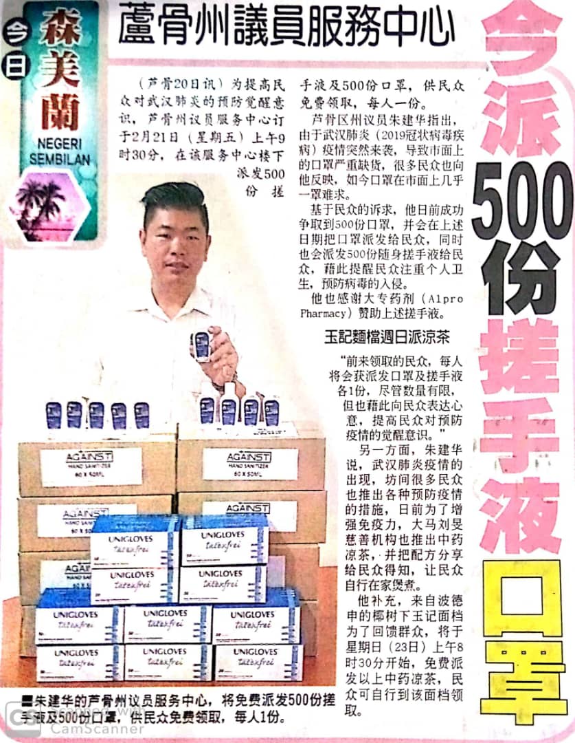 Tajuk :Port Dickson- EXCO Perpaduan,Penerangan dan Integrasi Nasional, YB Tn Choo Ken Hwa bersama Pusat Khidmat Kaunselor Negeri akan mengedarkan 500 kit pembersih kepada orang ramai.