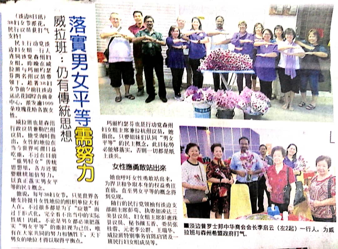 Tajuk :YB Yap Yew Weng, YB Ng Chin Tsai, YB Choo Ken Hwa, YB Teo Kok Seong serta YB Mary Josephine Prittam Singh mengedarkan 1,000 kuntuman bunga mawar kepada wanita-wanita di sekitar Seremban sebagai menghargai jasa sempena Sambutan Hari Wanita Antarabangsa.