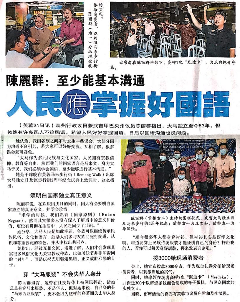 Tajuk :Seremban:YB Puan Nicole Tan Lee Koon telah menghadiri serta merasmikan Ulang Tahun ke-2 Benteng Walk Seremban dan Ambang Merdeka 2020 di Benteng Walk Seremban pada 30 Ogos 2020.